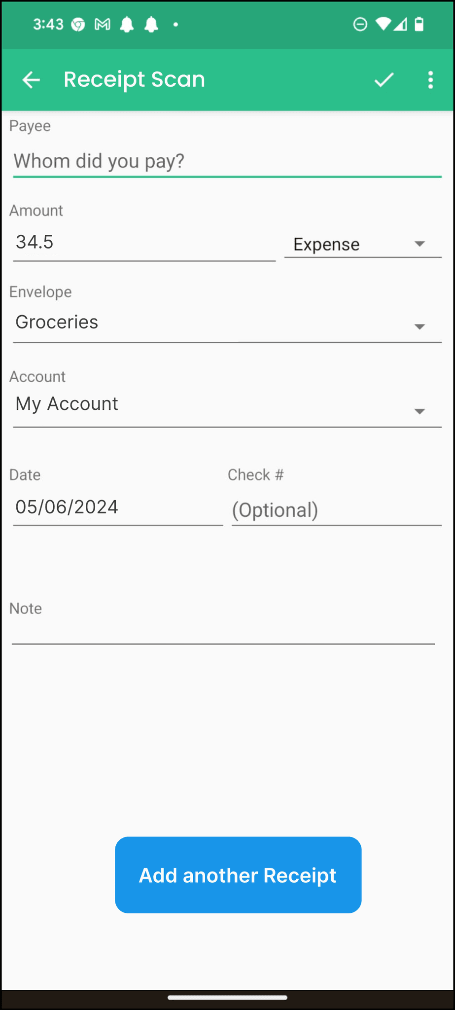 She opens her budgeting app and enters the information from one of her receipts. There are still two more remaining, and there are lots of fields to fill. Feeling overwhelmed, she closes the app.