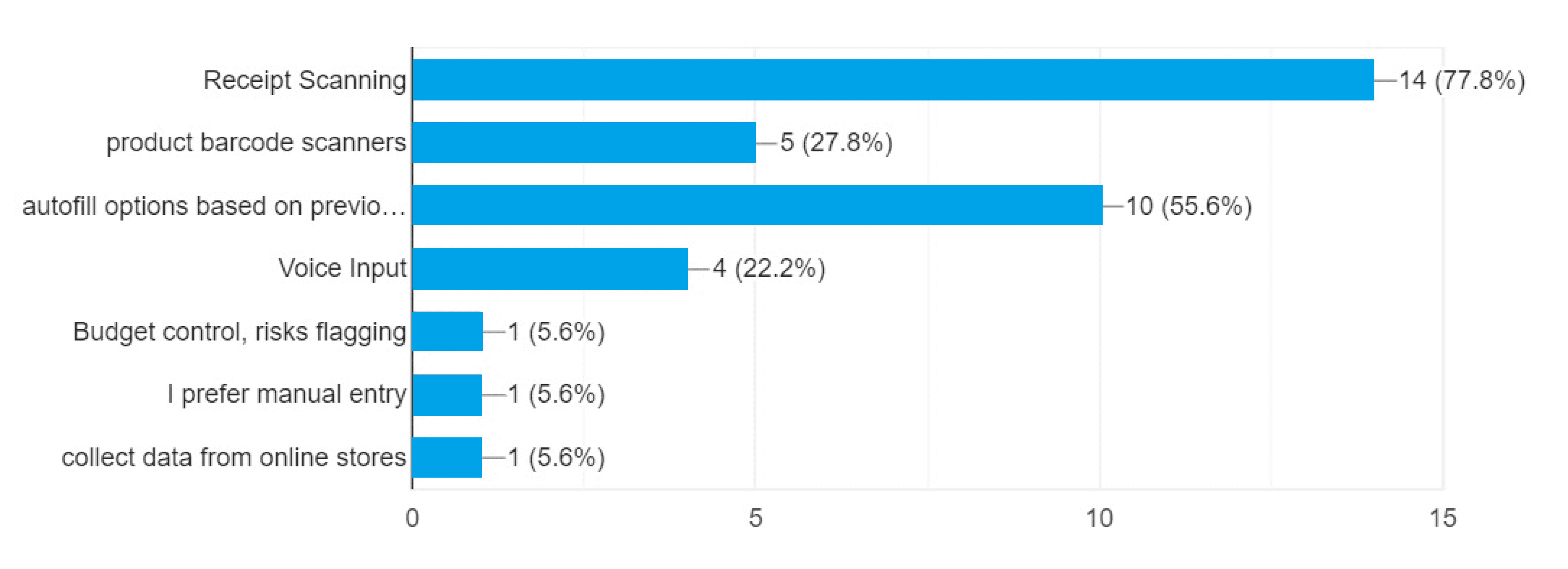 The user is already concerned about the amount of money spent and overwhelmed by the effort of buying various items when openning the app to input the data.n. Taking all of this into consideration, we created the survey questions. Here are the findings: